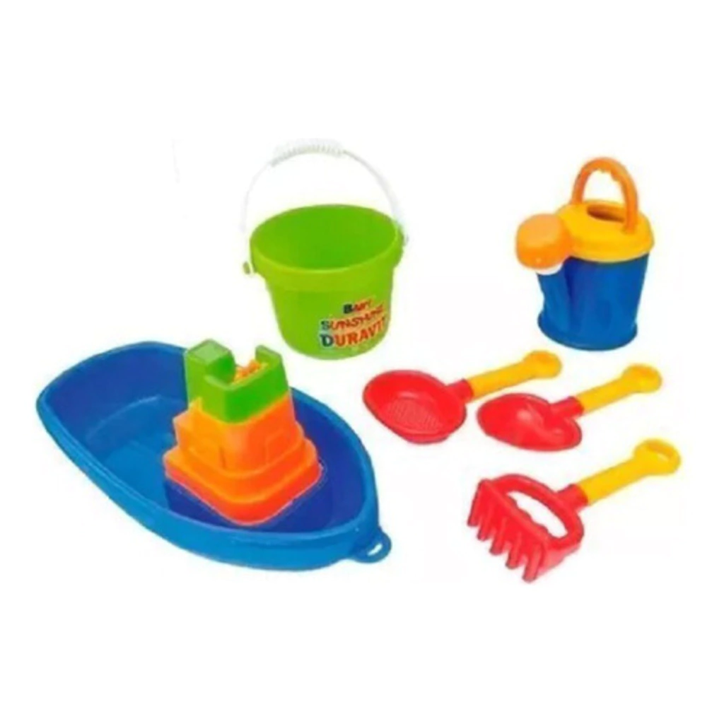 Incluye: 1 Barco - 1 Regadera - 1 Balde Mediano - 1 Pala - 1 Rastrillo - 1 Colador