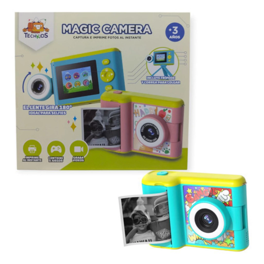 Incluye: Cámara digital infantil, Cable de carga USB, Correa de transporte, 3 rollos de papel, trípode, marcadores y Manual español.